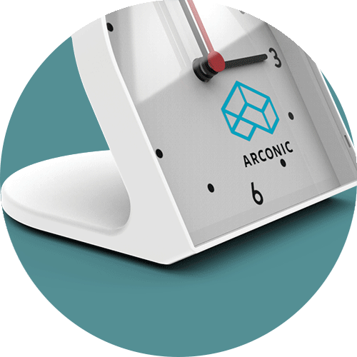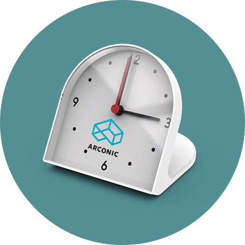 Chrono is a desktop clock with classic analog display and a sleek modern design. Features traditional hour, minute, bold red second hand and quartz precision movement. The clock face features hour markings of 12, 3, 6, & 9 and a dial on the back that can be used to easily set the time. Chrono makes a great gift that proudly displays your logo. A logo is full color digitally printed on the front face of the clock.