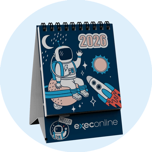 A compact, tent-style desktop calendar that keeps your brand visible year-round. This tent-style piece features 16 months in a clean, modern layout, coil binding for easy flipping, and space for quick notes — all in a compact format made to sit neatly on any desk. Ships flat in a cello bag, making it perfect for drop shipping.